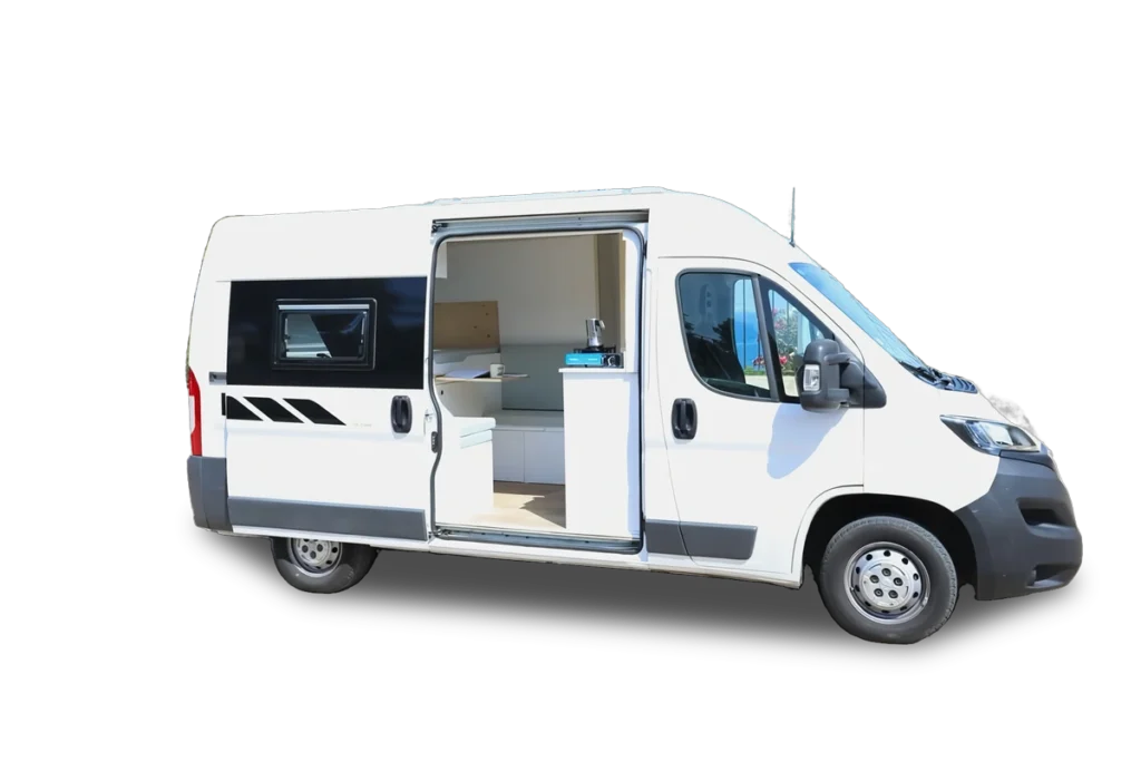 Nuestras campers están completamente equipadas: cama, menaje de cocina, energía auxiliar, nevera, utensilios, mesa… todo lo necesario para que te sientas como en casa sobre ruedas.